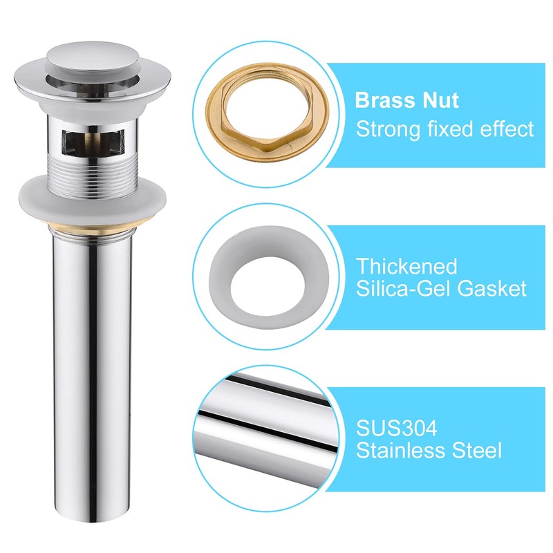 • 【Premium Material 】Our chrome popup drain is constructed from durable solid brass. Anti-explosion and anti-cracking thickened stainless steel, thickened stepped silica-gel gasket, no water leakage phenomenon.