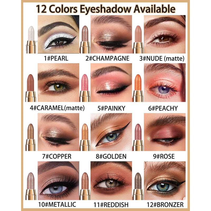 - MULTIFUNCTIONAL NO CREASE CRAYON EYESHADOW STICK - From warm to cool cream eye shadow makeup, from elegant pearl to sexy bronzer, from matte texture to shimmer texture. There are 12 popular colors for you to choose from. Highly pigmented eyeshadow sticks can be easily mixed. Just try it, make more combos and enjoy the fun matched to create the right look for your different dressing styles and occasions. Such as office makeup, natural makeup, party makeup and smoky makeup.