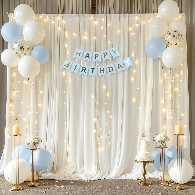 - Cream White Backdrop Curtains with Lights for Parties - Our white backdrop curtain can be used indoors and outdoors, they are perfect for baby shower, birthday party, wedding, graduation ceremony, dessert tables, anniversary, New Year's Eve party, stages photography or any other important events. It is also a good choice to use this white backdrop curtains for photoshoot.