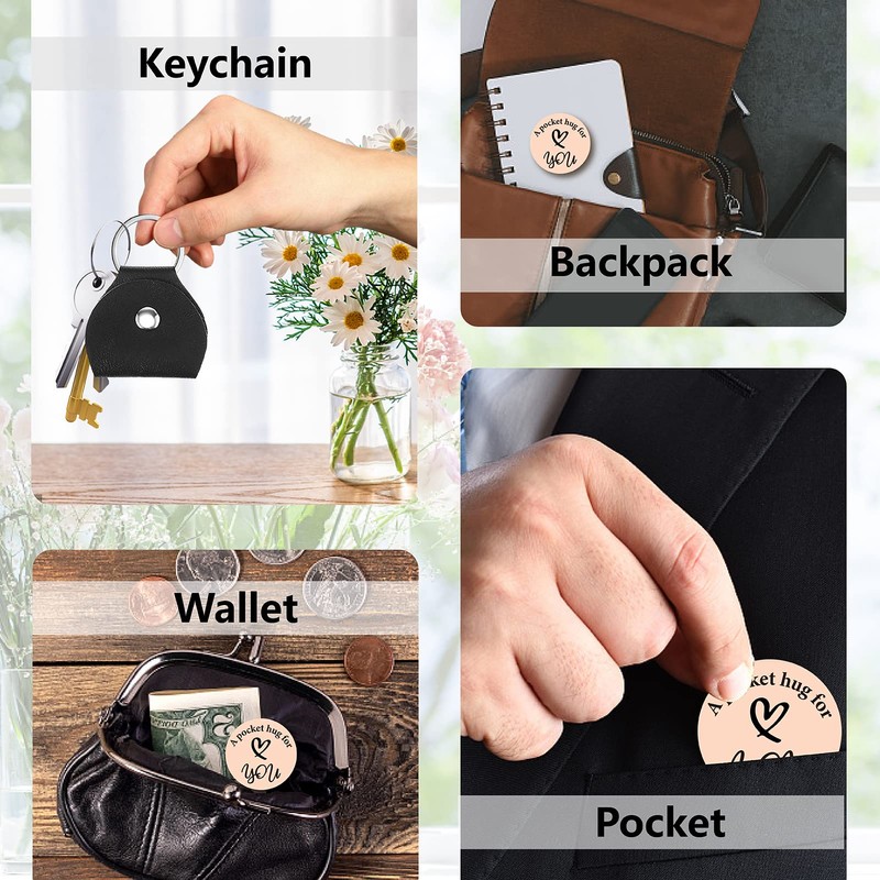 • [STAINLESS STEEL MATERIAL]: Pocket hug token is made of stainless steel, sturdy and not easy to rust, fade or tarnish; The keychain is mainly made of PU leather, soft and lightweight, suitable for long-term use.