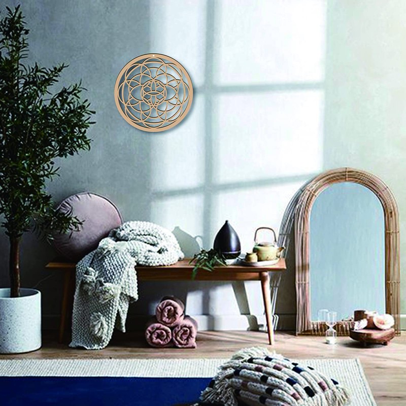 CREATCABIN 10inch Wood Flower Wall Decor Wooden Wall Art Crystal Grid Sacred Geometry Laser Cut Wall Sculpture Hanging Decor Spiritual Symbol Round for Housewarming Home Office Yoga Studio Decoration