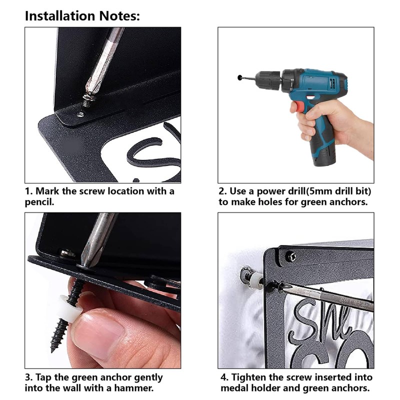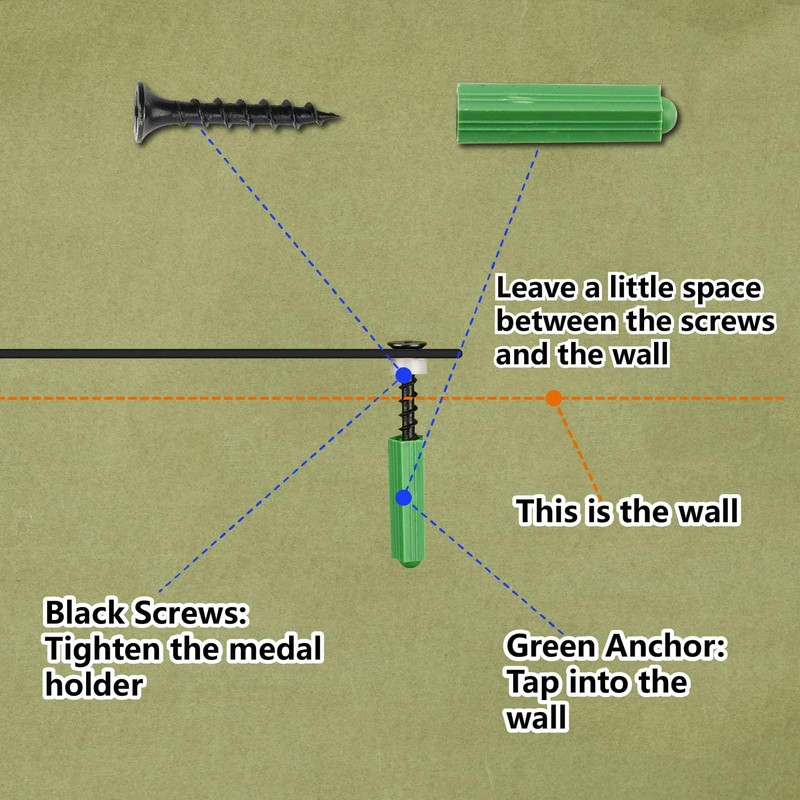 - [EASY TO ASSEMBLE]: ① Make the screw locations with a pencil. ② Use a power drill(5mm drill bit)to make holes for the wall anchors. ③ Tap the wall green anchor gently into the wall.④ Tighten the screw inserted into medal holder and green anchors. (NOTE: Please keep distance between the anchor and the screw to prevent the medal hook from clinging to the wall, so as to facilitate the hanging of the medal)