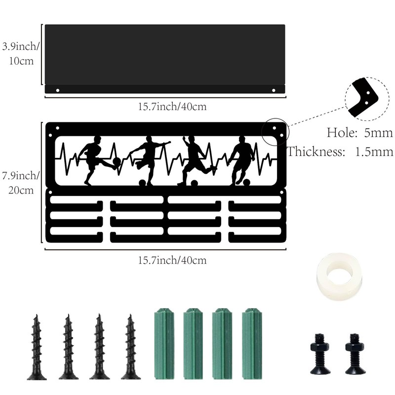 - Medal Rack with Shelf: Medal holder rack * 1pc: 15.7 x 7.9 x 3.9 inch(40 x 20 x 10cm), thickness: 1.5mm, hole: 0.2 inch(5mm), 1pc x gift package box. The medal rack can hang more than 60 medals