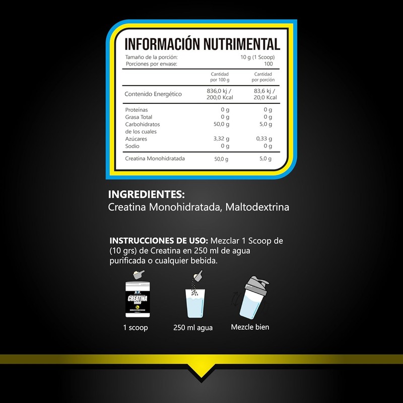 Mezcla de Creatina Monohidratada que contiene 10grs por servicio, de los cuales 5 grs son de creatina monohidratada. INTRUCCIONES DE USO : Mezclar 1 servicio en 250ml de agua purificada y agitar bien.