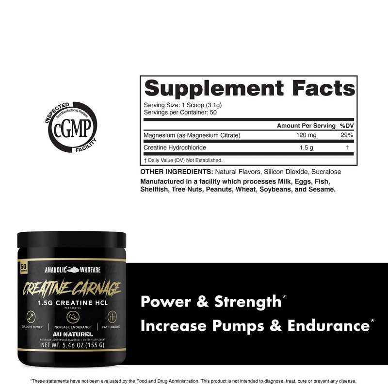 - Maximize Strength* - Creatine Carnage HCL uses ultra-pure ingredients to provide you with maximum results. Many creatine supplements are underdosed and produce little to no results. This product utilizes the power of Creatine HCL to support increased strength and power.*