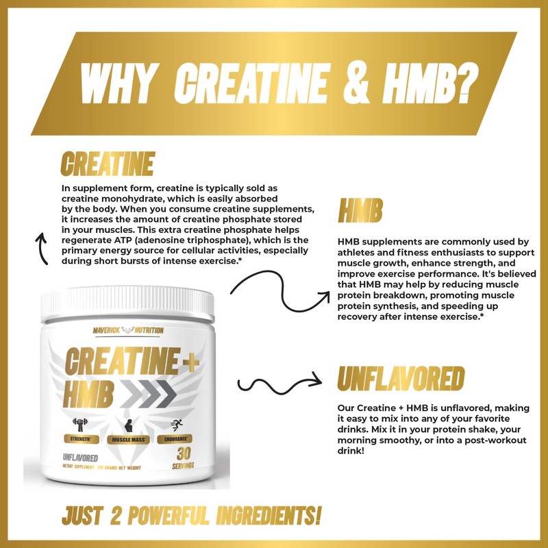 Introducing the ultimate Creatine + HMB supplement – your go-to supplement for athletes and fitness enthusiasts alike. This powerhouse formula combines two of the most potent and scientifically proven ingredients, creatine and HMB, to help you smash your fitness goals and take your workouts to the next level.Why Choose Creatine + HMB?1. Amplify Muscle Growth: Creatine is a staple for muscle building, known to increase strength and muscle mass by supplying energy to your muscles during high-intensity exercise. When paired with HMB (Beta-Hydroxy Beta-Methylbutyrate), which reduces muscle breakdown and promotes protein synthesis, you get the perfect formula for rapid, lean muscle gains.2. Boost Strength and Power: Feel the surge of energy and power as you lift heavier, push harder, and go further. The creatine in this supplement supercharges your ATP production, providing your muscles with the energy they need for explosive movements and prolonged endurance.3. Speed Up Recovery: Don't let soreness slow you down. HMB helps to minimize muscle damage and supports faster recovery, so you can get back to training sooner and stay consistent with your routine.4. Enhance Endurance: Train longer and more efficiently. This supplement helps to buffer lactic acid buildup, delaying the onset of fatigue and allowing you to power through even the most grueling workouts.5. Pure and Potent Formula: Crafted with the highest quality ingredients, ensuring maximum absorption and effectiveness. No fillers, no fluff – just pure performance in every scoop.