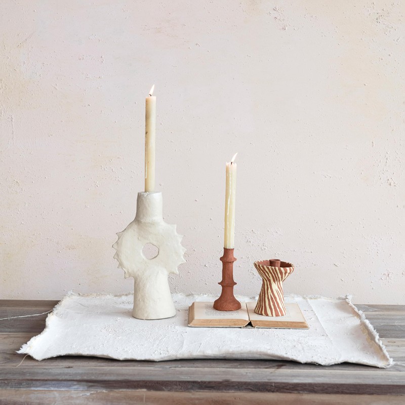 - A unique and artistic taper holder that features a handmade paper mâché base in a spiked shape and a natural color