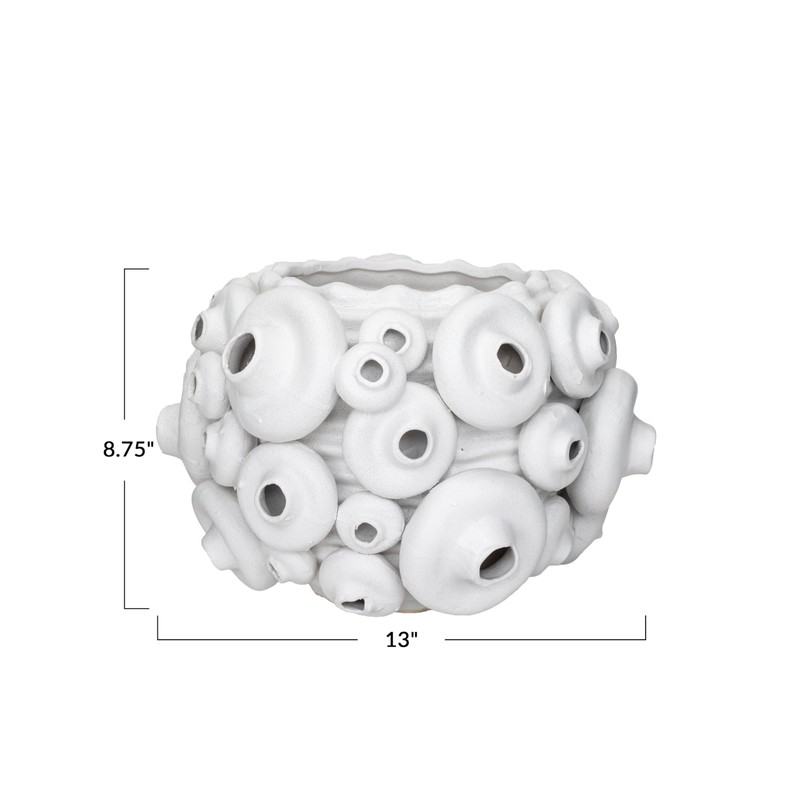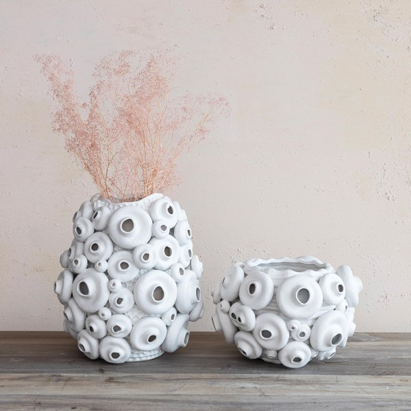 - A stunning and large handmade stoneware vase that has a textured coral design and a sand finish in cream color