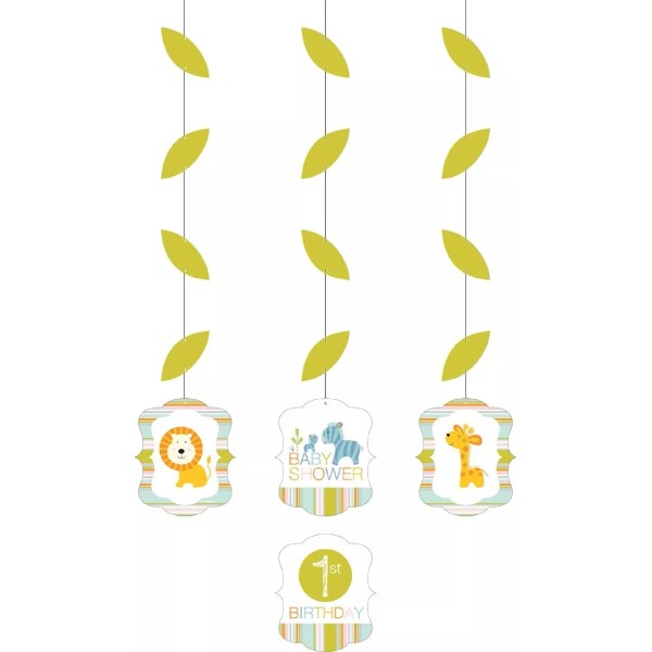 This 3 ct. package of 36" hanging cutout decorations w/stickers is part of the Creative Converting "Happi Jungle" baby shower party collection. The item is new.