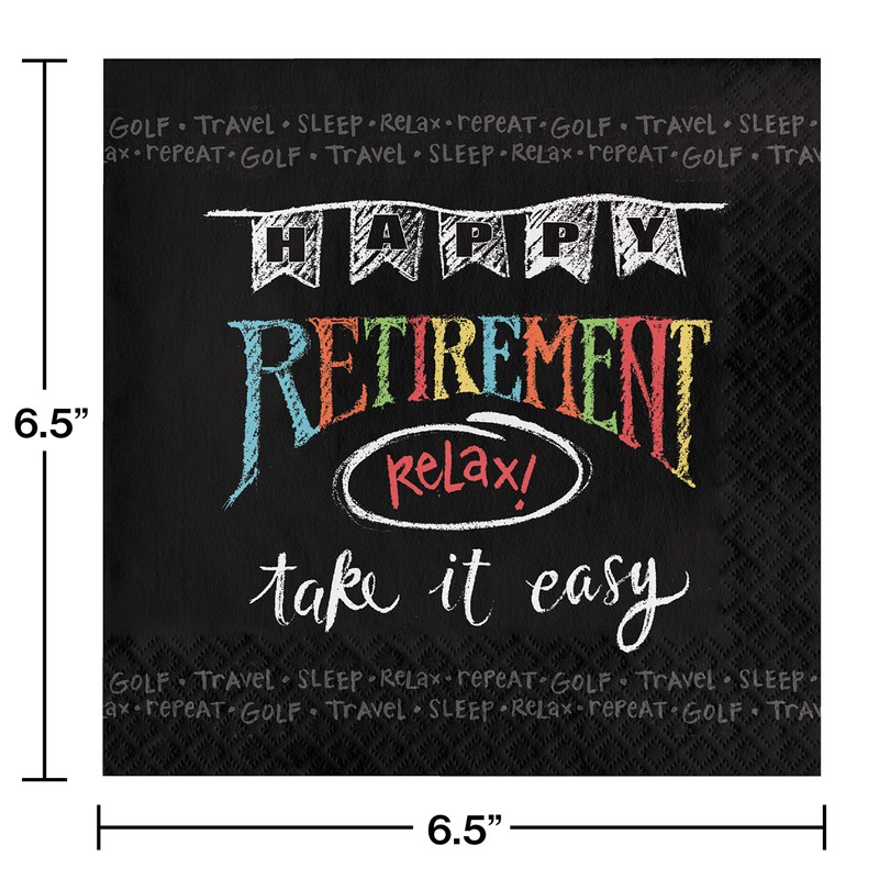 - Paquete de 16 servilletas de papel de 3 capas para almuerzo; aproximadamente 16,5 x 16,5 cm plegadas; fabricado en los Estados Unidos; arte de estilo pizarra para una fiesta de jubilación; busca vajilla de tiza de jubilación y suministros de fiesta y toque de colores sólidos a juego clásico rojo y lima fresca