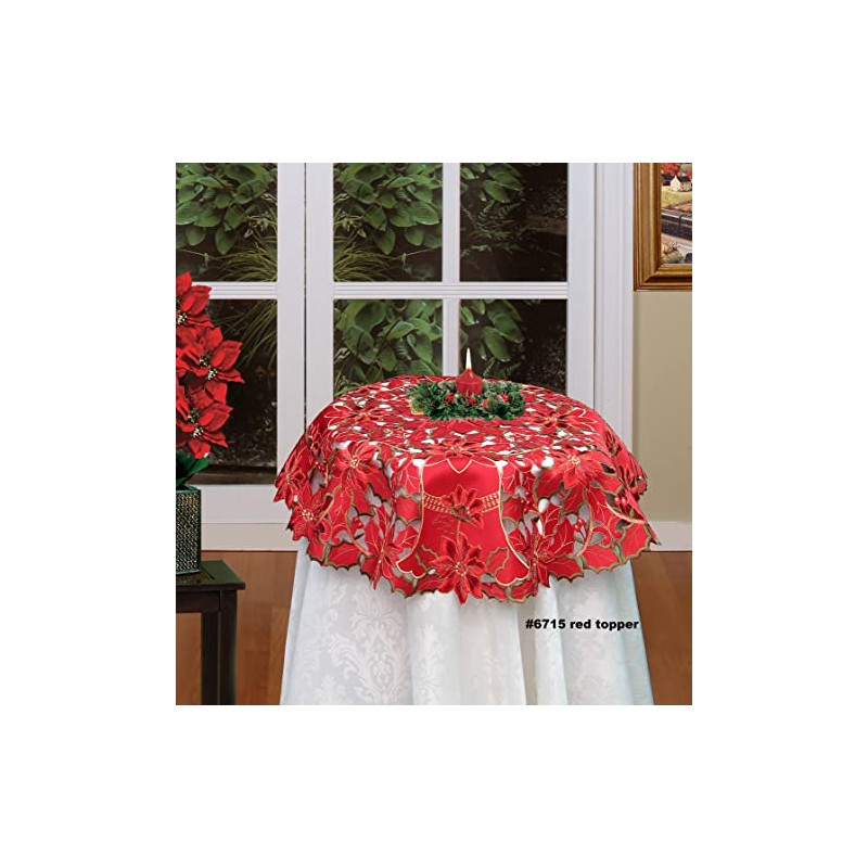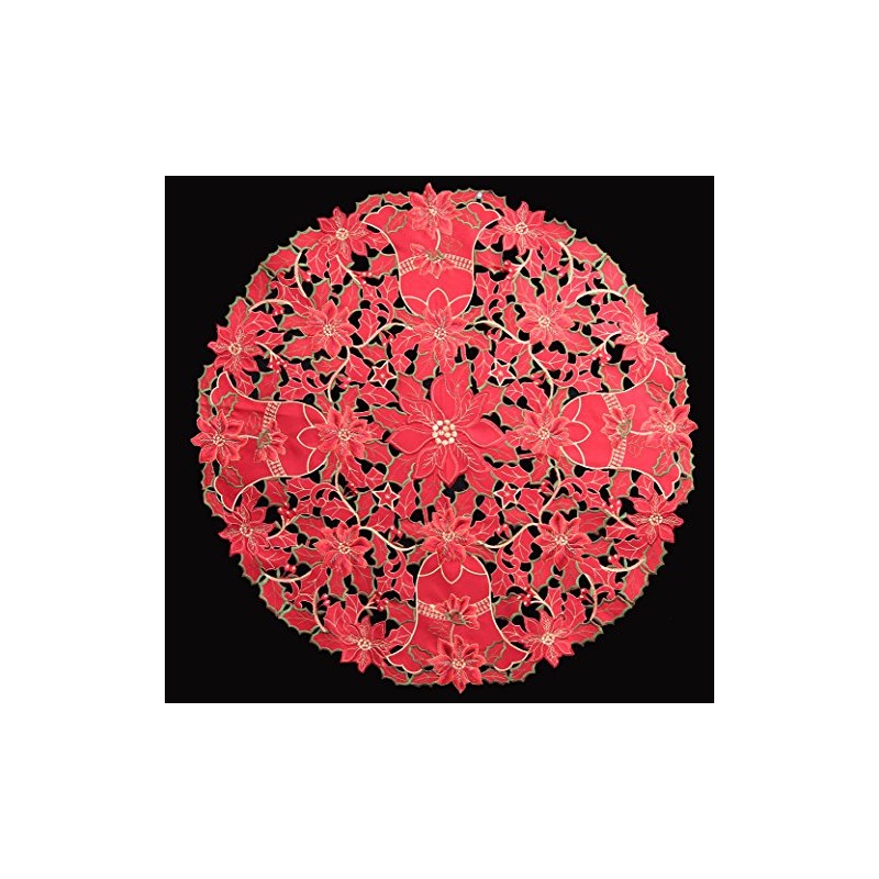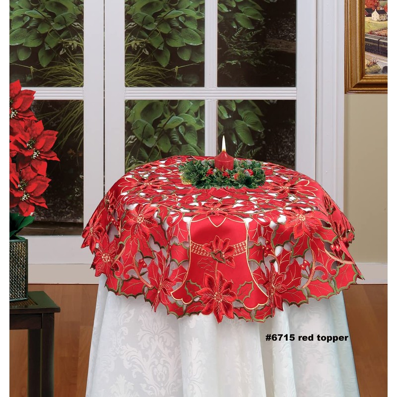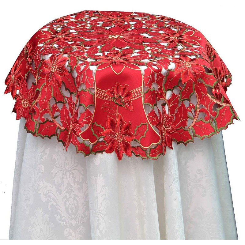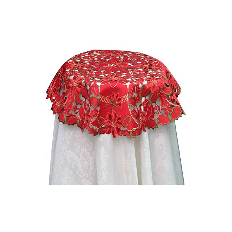 Creative Linens Holiday Christmas Embroidered Tablecloth Poinsettia Bell Table Cloth Topper RED Round or Square (33" Round)