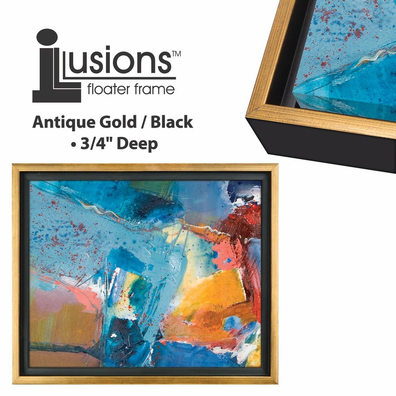 Creative Mark Illusions Floater Frame For 3/4" Deep Canvases - 8x10 Black w/Antique Gold Edge - Set of 4- For Galleries & Home Decor - Wood Float Frame for Canvas Paintings - w/Hanging Hardware