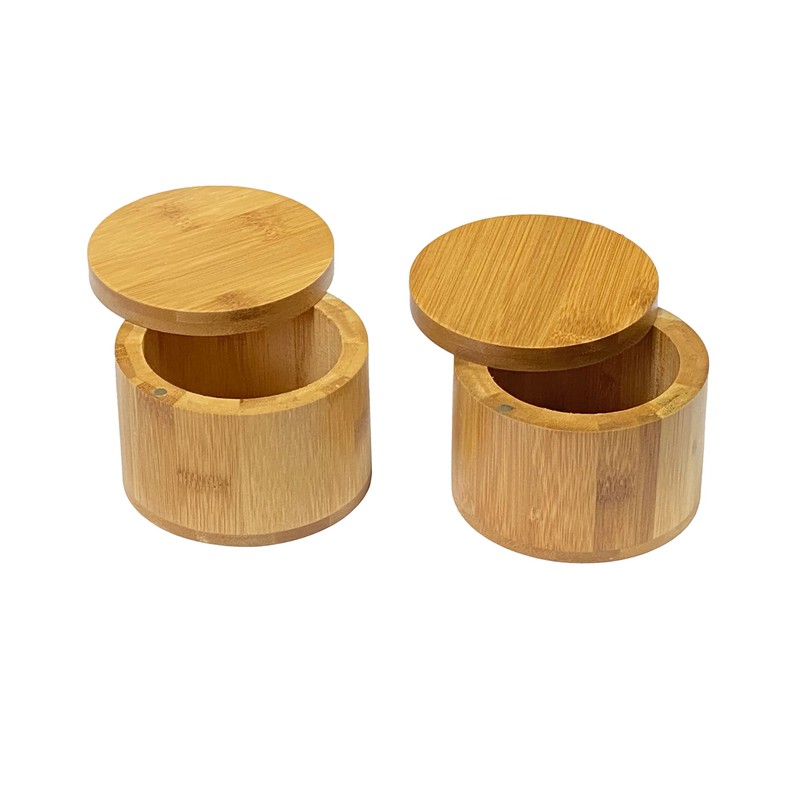Cregugua 2-Pack Bamboo Salt Keeper Jars Pepper Holder Round bamboo Storage with Magnetic Swivel Lid (6 OZ)