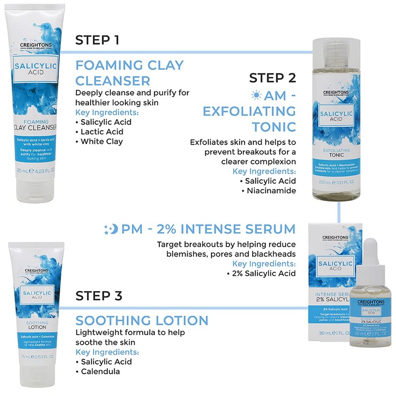 Elevate your skincare routine with Creightons Salicylic Acid Exfoliating Tonic, designed to deliver clearer, healthier-looking skin every day. This powerful tonic combines 1% Salicylic Acid and 1% Niacinamide to gently exfoliate your skin, target blemishes, and improve the condition of blemish-prone skin.