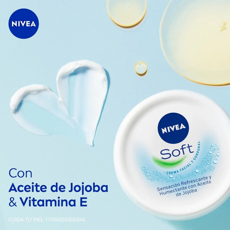 Descubre la fórmula avanzada de NIVEA Soft creme multiusos, una crema hidratante intensiva que revitaliza tu piel día tras día. Con una combinación única de vitamina E y aceite de jojoba, esta crema corporal ligera ofrece una hidratación profunda y duradera para todo tipo de piel, desde la más seca hasta la más sensible. Su textura suave se absorbe al instante, dejando una sensación refrescante sin residuos grasos.
