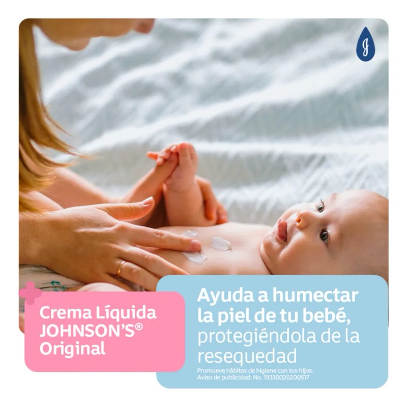 Crema Líquida Johnson’s Original contiene glicerina vegetal y aceite de coco* que ayudan a humectar la piel del bebé hasta por 24 horas y a protegerla de la resequedad. Su fórmula tiene el pH ideal para su piel, fortaleciendo la barrera natural.