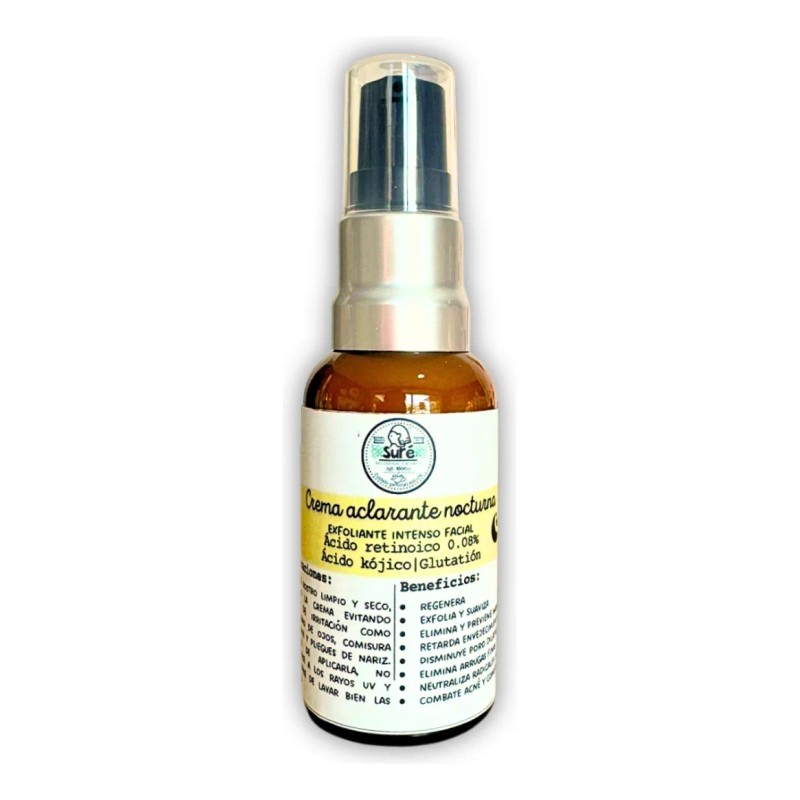 Crema aclarante libre de perfumería sintética, sales, sulfatos, siliconas, alcoholes y parabenos. Ingredientes: -Multivitaminas -Ácido kójico -Ácido retinóico -Glutation -Mucho mas. Beneficios: -Atenua arrugas y líneas de expresión. -Nutre e hidrata el rostro a profundidad. -Brinda elasticidad reafirmando la piel. -Suavidad al rostro. -Despigmenta manchas de paño, solares, pecas y cicatrices oscuras. -Evita imperfecciones (nuevos brotes acneicos). -Aclara y unifica el tono de la piel. -Controla la hiperpigmentación causada por los rayos UV. -Efecto peeling (desmación de la piel). Recomendaciones y tips: -Aplicar de forma ascendente, comenzando con 2 aplicaciones máximo semanalmente. (aun sin síntomas de irritación no abusar de su uso). -Evitar tocar o retirarse la piel muerta con exfoliantes ni con los dedos. (Evite tocar el rostro). -Lavar la cara solamente cuando sea necesario. -Aplicar mas producto no hará mas rápido el proceso, sólo se gastará y podrá irritar su piel provocando mas manchas.