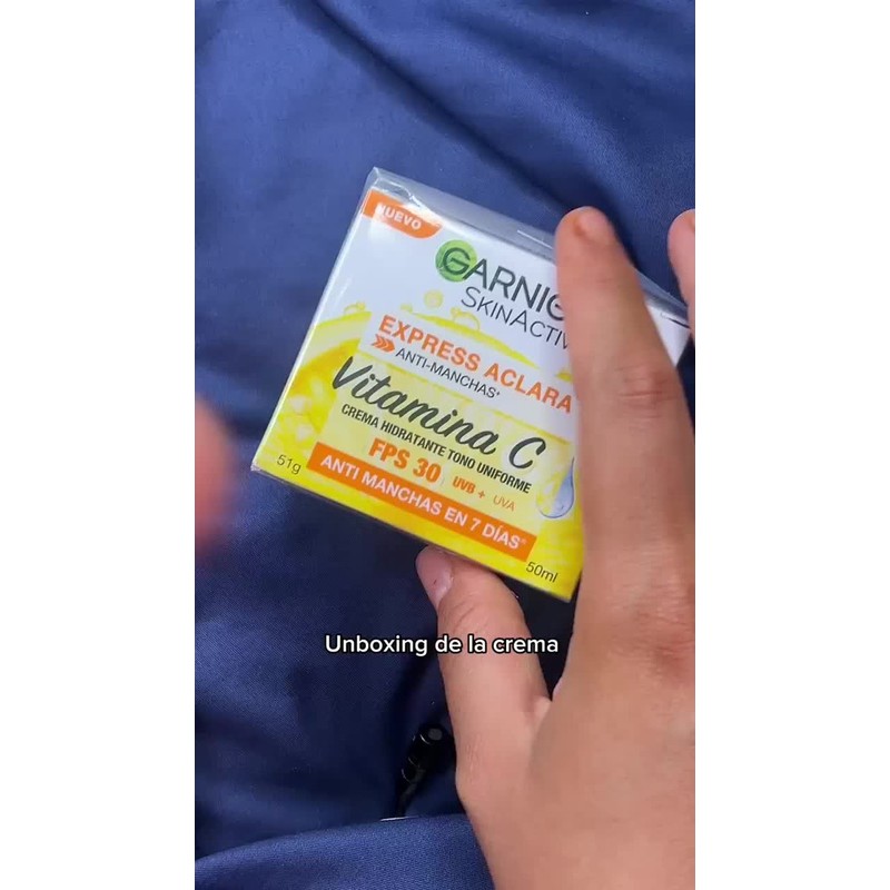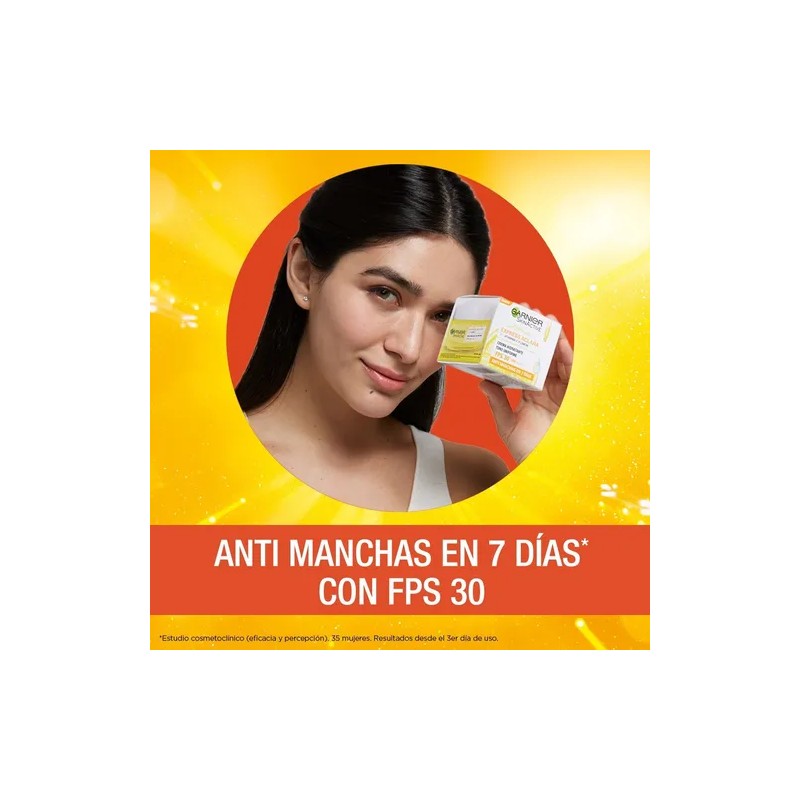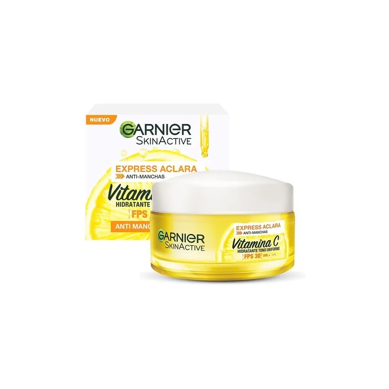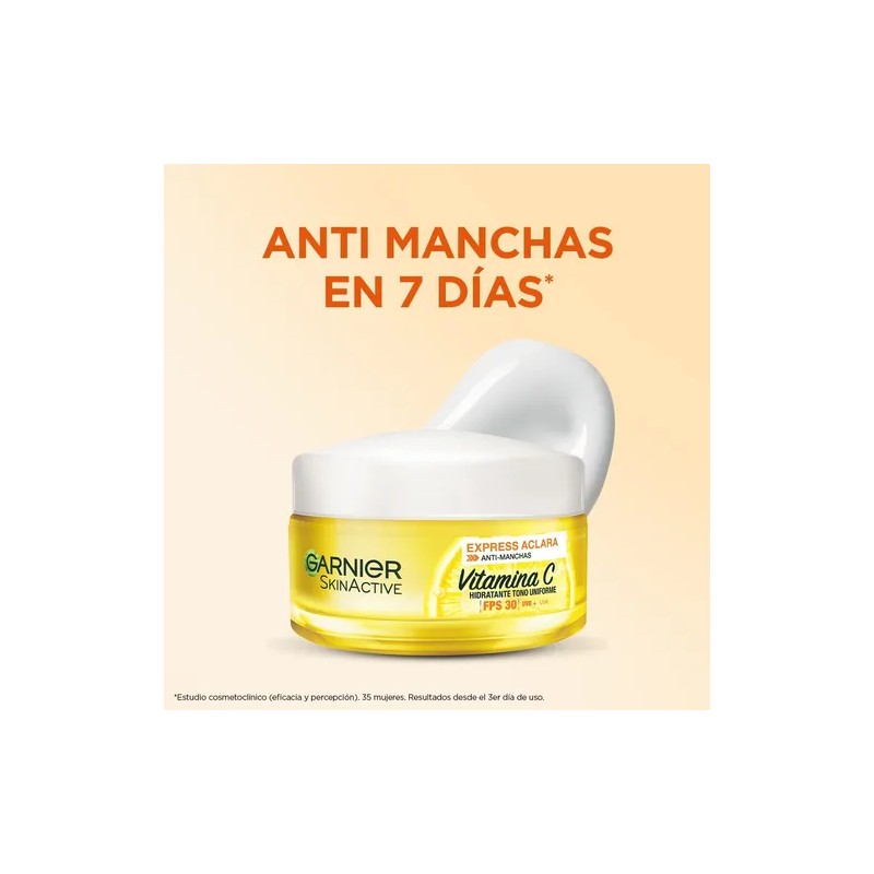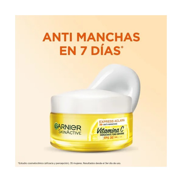 Garnier express aclara crema aclarante con fps30 anti manchas hidrata tu piel con la crema hidratante tono uniforme con FPS 30 y Vitamina C, tu piel lucirá radiante y uniforme desde el primer uso.