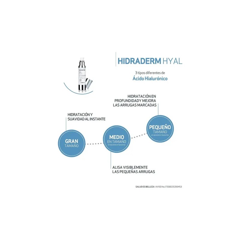 La hidratación es el primer paso y esencial para mantener la juventud de la piel, ya que una crema hidratante de calidad es capaz de retrasar la aparición de las primeras arrugas. En el caso de Hidraderma Hyal crema sus 3 tipos de ácido hialurónico proporcionan la hidratación multiplicada por 3. Por eso es ideal para todas las edades y tipos de piel. No te dejes engañar por su textura ultraligera. Hidrata mucho más y mejor (en superficie y en profundidad) que las texturas más untuosas. Así que, aunque tengas la piel seca, ¡esta es tu hidratante!