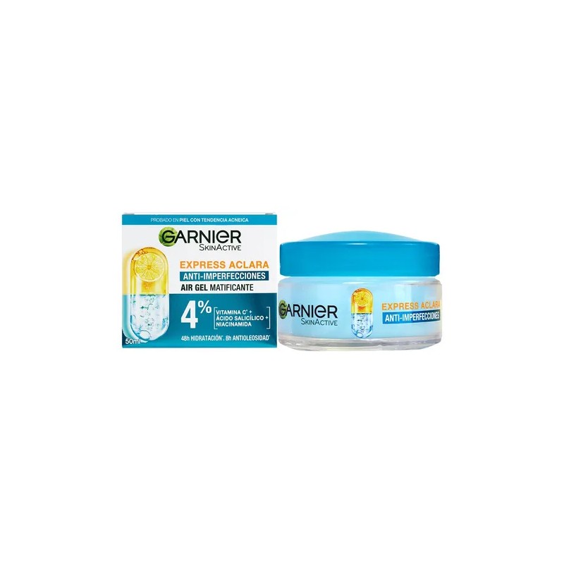 ¡Piel libre de brillo e imperfecciones en un solo paso! ✨💚 La Crema Hidratante Matificante Garnier Skin Active Express Aclara combina Vitamina C, Ácido Salicílico y Niacinamida para hidratar, controlar la oleosidad y aclarar la piel 🍊💧. ¡Tu aliada perfecta para un rostro fresco, uniforme y sin exceso de grasa! 🌿🧴