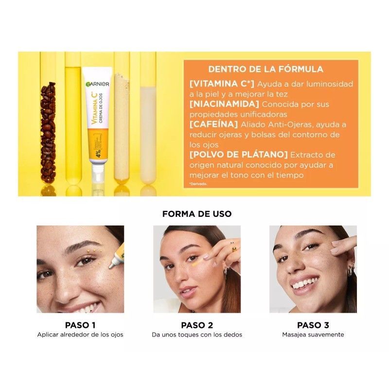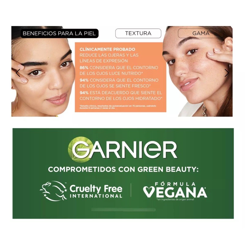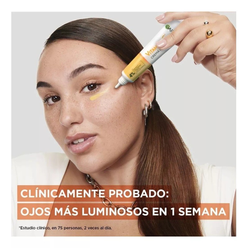 - Marca: Crema para ojos Garnier Skin Active express aclara vitamina C antiojeras 15 ml