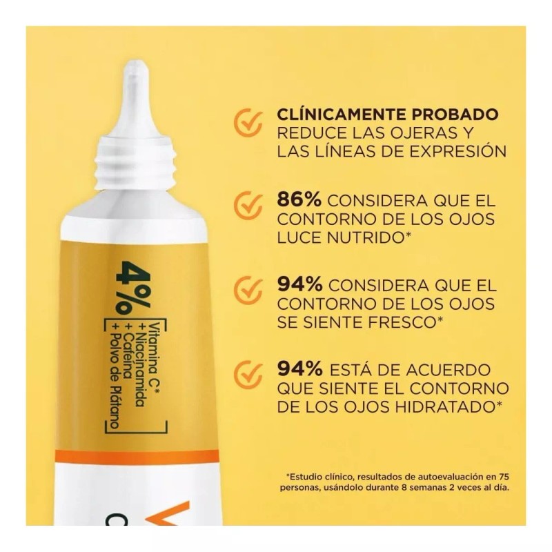 Descubre la nueva Crema para el contorno de Ojos de Express Aclara Anti-manchas con Vitamina C y sus poderosos activos al 4% (vitamina C, Niacinamida, cafeína y polvo de banana) probados clínicamente.