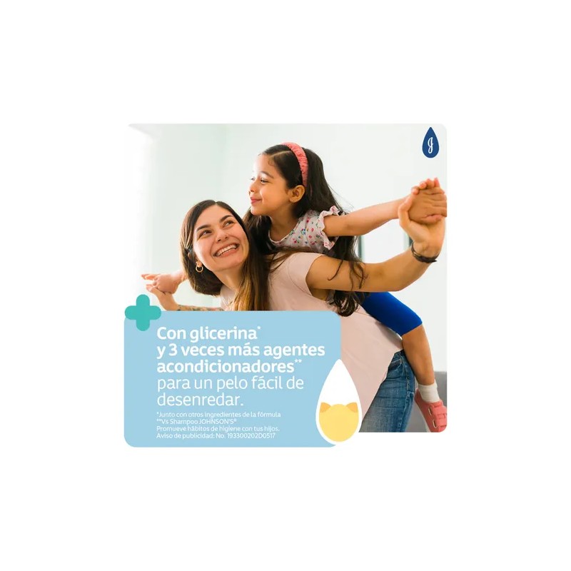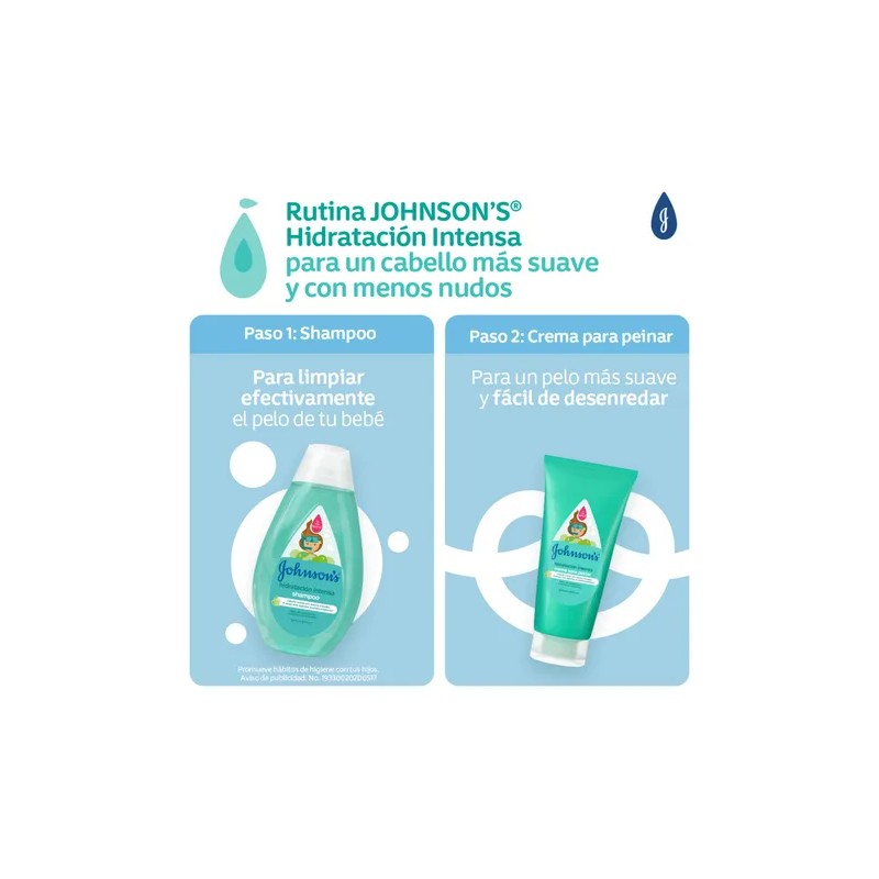 Los resultados serán aún mejores si se complementa con los productos de la línea Johnson's Hidratación Intensa: Shampoo + Acondicionador + Crema para peinar. Uso recomendado en niños desde los 2 años de edad en adelante. *vs Johnson's® baby acondicionador.
