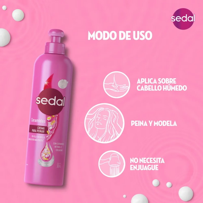 La vida está llena de oportunidades para deslumbrar. Sedal acompaña a las mujeres en cada desafío con un cabello saludable e hidratado, en un mundo vibrante y en constante cambio. Deslumbra con un cabello brillante, hidratado y fuerte que se mantenga así a pesar de todo con nuestra Crema para Peinar Sedal Ceramidas. Nuestra fórmula desarrollada con tecnología Hydra-Active contiene ceramidas que ayudan a fortalecer el cabello, retinol que contribuye a un crecimiento saludable, y colágeno, conocido por retener la humedad para un efecto terso y suave.