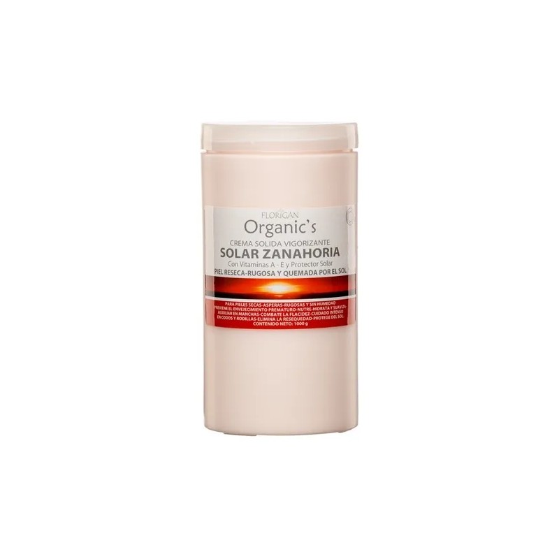 Crema Sólida Vigorizante Solar de Zanahoria con Extra Concentración de Vitaminas A y E Organics 1kg. Florigan Esta raíz vegetal es una rica fuente de vitaminas A, E y del grupo B, minerales, carbohidratos y carotenos, el conjunto de estos elementos ayudan a nutrir y proteger la piel de las nocivas radiaciones solares. Piel áspera y dañada Humecta y vigoriza intensamente Crema sólida con antioxidantes que fomentan la reparación profunda de la piel. Previene la aparición de signos de envejecimiento. Regulariza el tono de las manchas blancas y oscuras. Revitaliza y provee humedad y suavidad al cutis. Conforta codos, rodillas y talones secos. Protege de las agresiones solares.