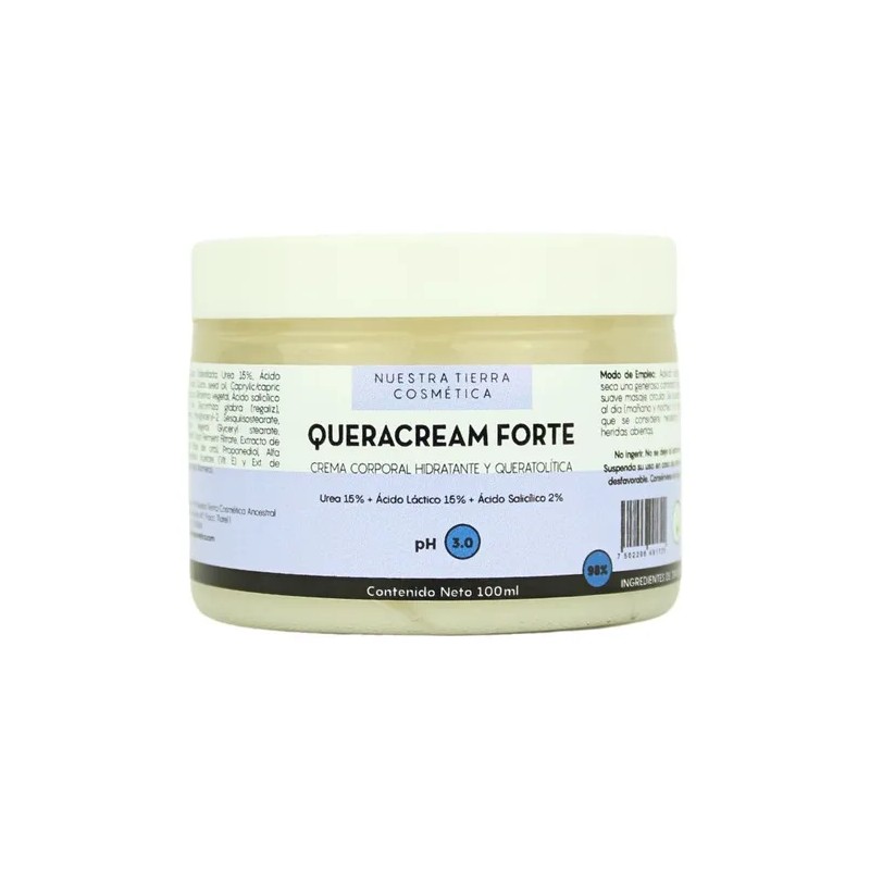 Ingredientes: Agua Tridestilada, Urea 15%, Ácido Láctico 15%, Prunus Dulcis seed oil, Caprylic/capric triglyceride de Coco, Glicerina vegetal, Ácido salicílico 2%, Extracto de Glycyrrhiza glabra (regaliz), Hidroxietilcelulosa, Polyglyceryl-2 Sesquiisostearate, Ácido Esteárico Vegetal, Glyceryl stearate, Leuconostoc/Radish Root Ferment Filtrate, Extracto de Rhodiola rosea (Raíz de oro), Propanediol, Alfa Bisabolol, Tocopherol Acetate (Vit. E) y Ext. de Rosmarinus officinalis (Romero).