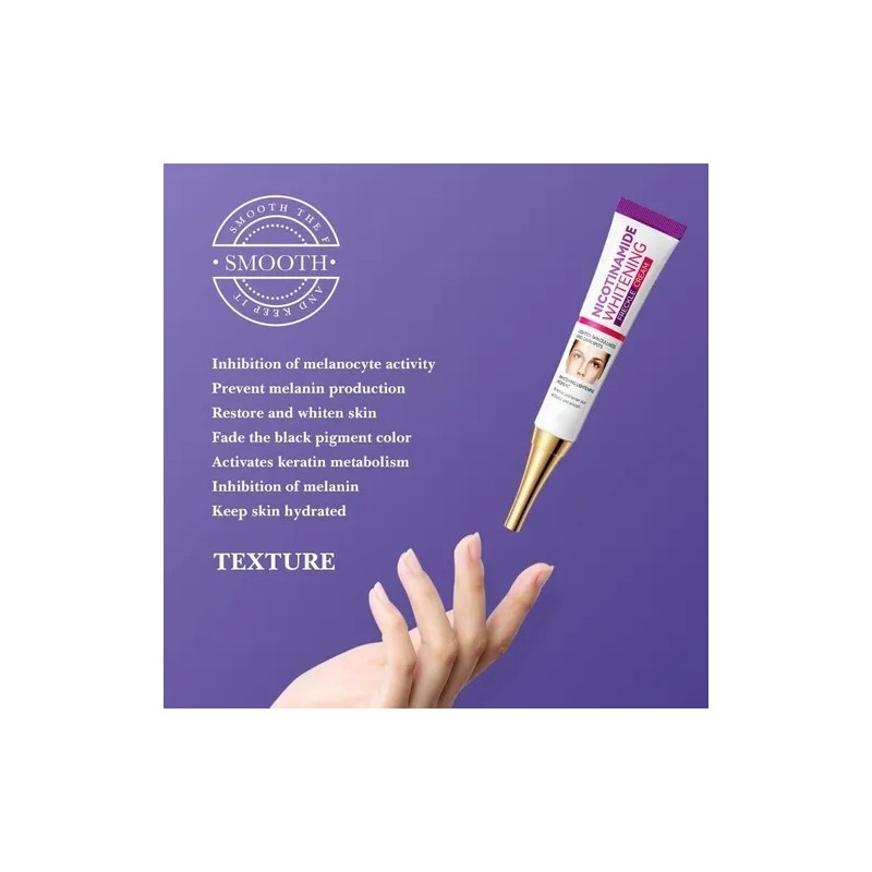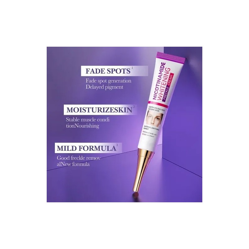 Características principales Modelo como se describe Uso Momento de aplicación Día/Noche Zonas de aplicación Rostro Peso Peso de la unidad 20 g Especificaciones Formato del producto Crema Características generales Marca Genérica Nombre Nicotinamide Whitening Freckle Cream Tipo de piel Todo tipo de piel Funciones Lighten skin dullness and dark spots