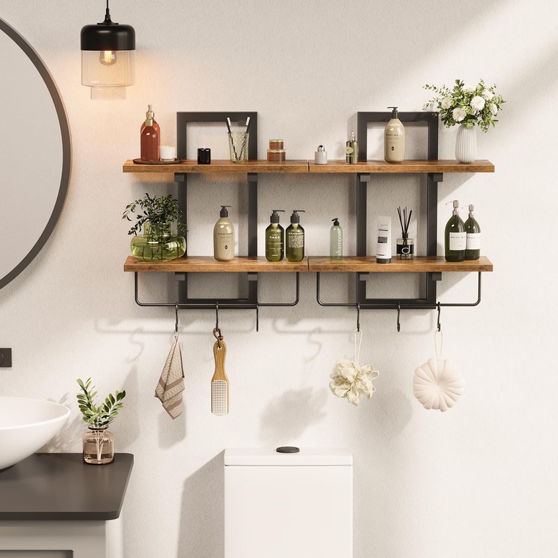Creso hom Floating Shelves with Hooks, Wood Wall Shelves for Living Room, 2 Tier Hanging Decorative Wall Shelves Set of 2, Wall Mounted Shelves for Kitchen, Bathroom, Office, Bedroom, Rustic Brown