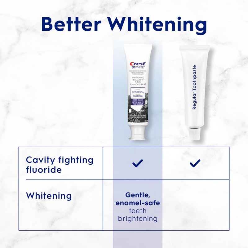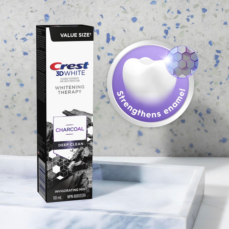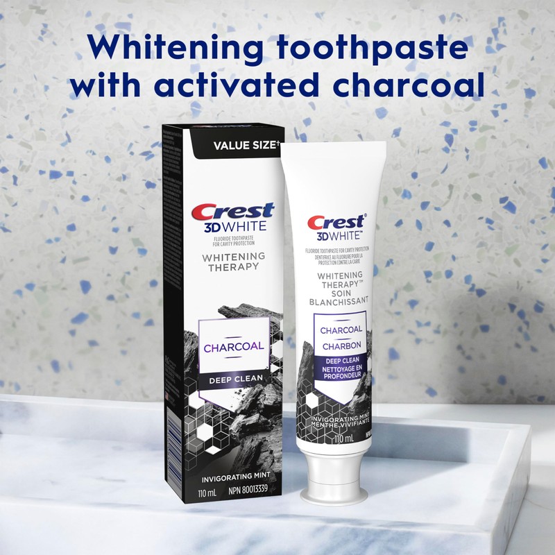 It's not just whitening- it's deep clean therapy with charcoal for your teeth! Crest 3D White whitening therapy deep clean black and white striped charcoal toothpaste gently whitens teeth by removing surface stains and gives you a clean, fresh feeling with its invigorating mint flavour. Also, it is a fluoride toothpaste that remineralizes weakened enamel to help strengthen teeth and fight cavities. For best results, pair with a Crest 3D White toothbrush or 3D White electric toothbrush head.
