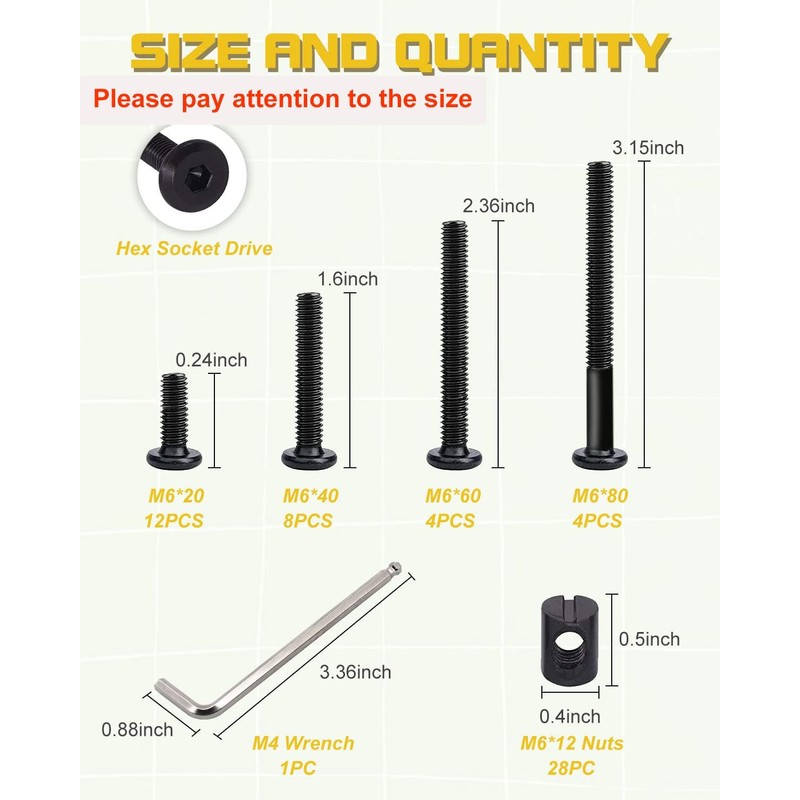 - 【SIZE INCLUDED】Baby bed crib screws bolts hardware kit includes 28pcs m6 x 20mm/40mm/60mm/80mm bolts and 28pcs m6x12mm barrel nuts,1pc m4 wrench;
