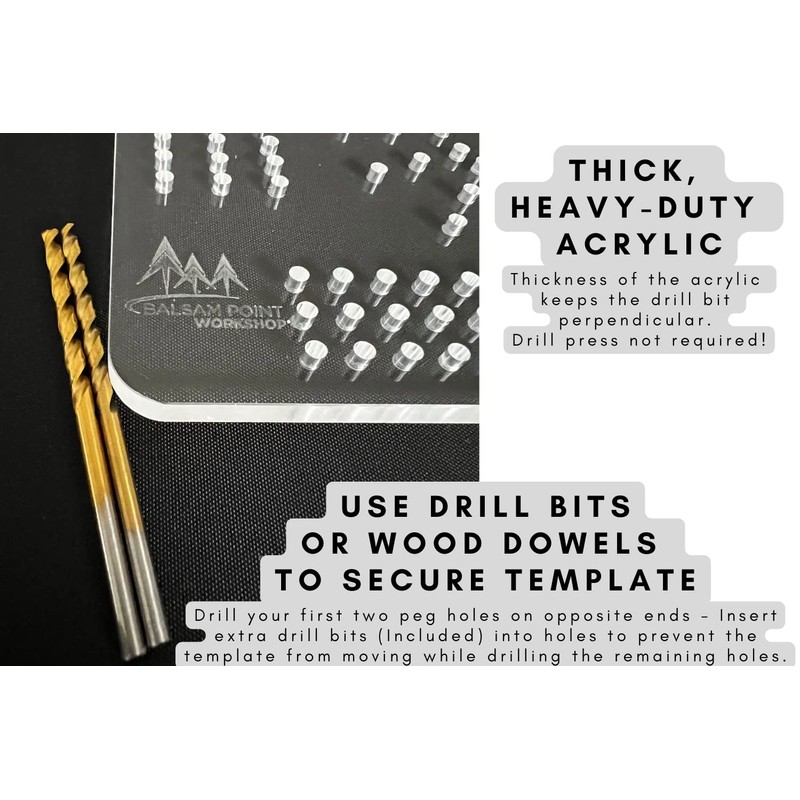 - DURABLE: Heavy-duty 1/4-inch-thick clear acrylic resists wear and tear. Template can be used with a drill press or standard handheld drill. Heavy thickness of the acrylic works great to guide your drill bit perpendicular to the playing surface to ensure game pegs stand straight.