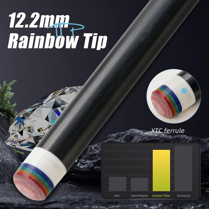 [Carbon fiber pool cue shaft] The pool cue stick measures 58 inches, and it has 12.5mm rainbow cue tip and XTC white ferrule.