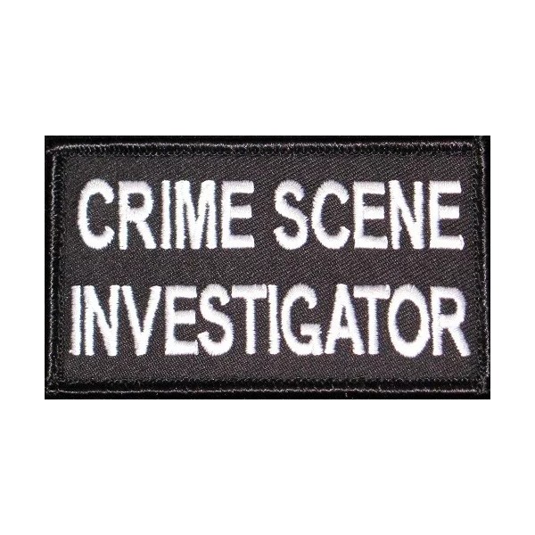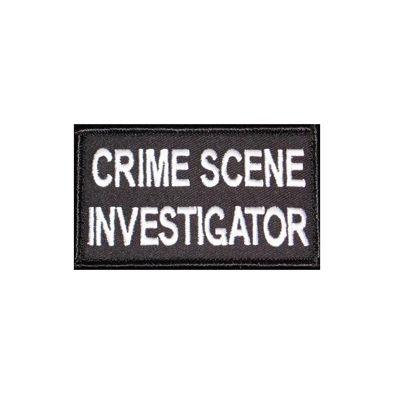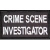 CRIME SCENE INVESTIGATOR embroidered patch. White letters on black background, with hook backing, measures 2" X 3 3/8".