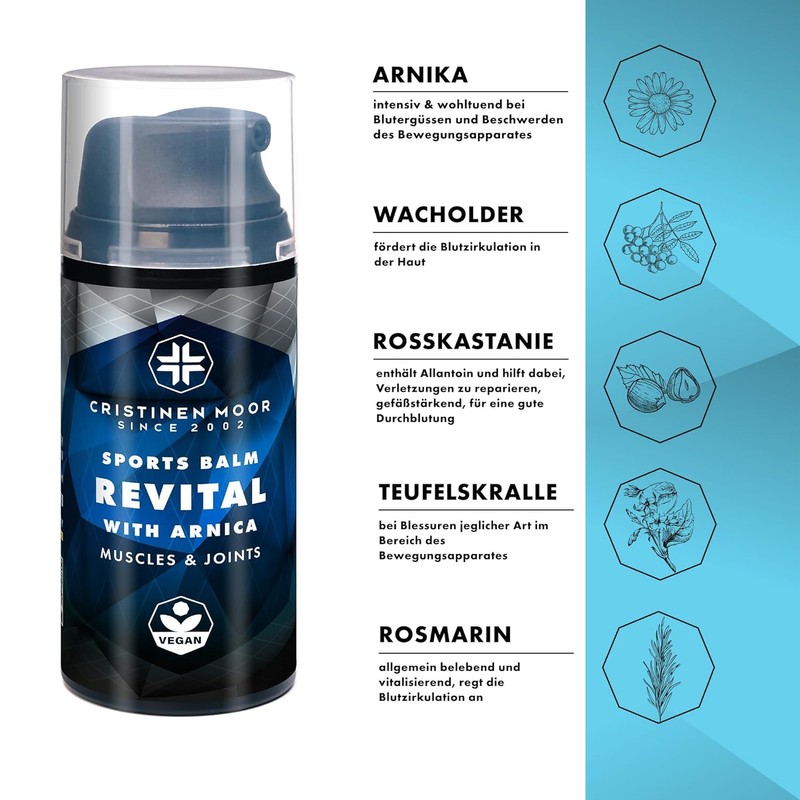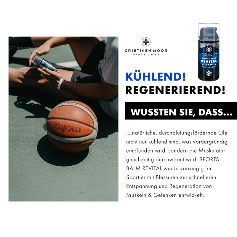 - CristinenMoor Sports Balm Revital is suitable for all sports and can be used both before and after training. Before sports, it loosens the muscles, after sports, it is pleasantly soothing and regenerating.