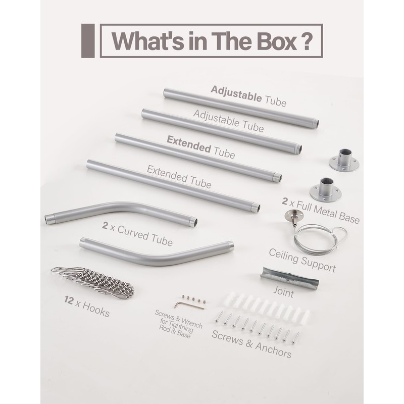 - What You Get -- This adjustable shower rod is not just a practical addition to your bathroom, but also a refined home ornament. It comes with 12 packs of free ring hooks and a ceiling support, 2 x curved tube, 2 fixed tube, 2 x adjustable tube, 2 x full solid metal base