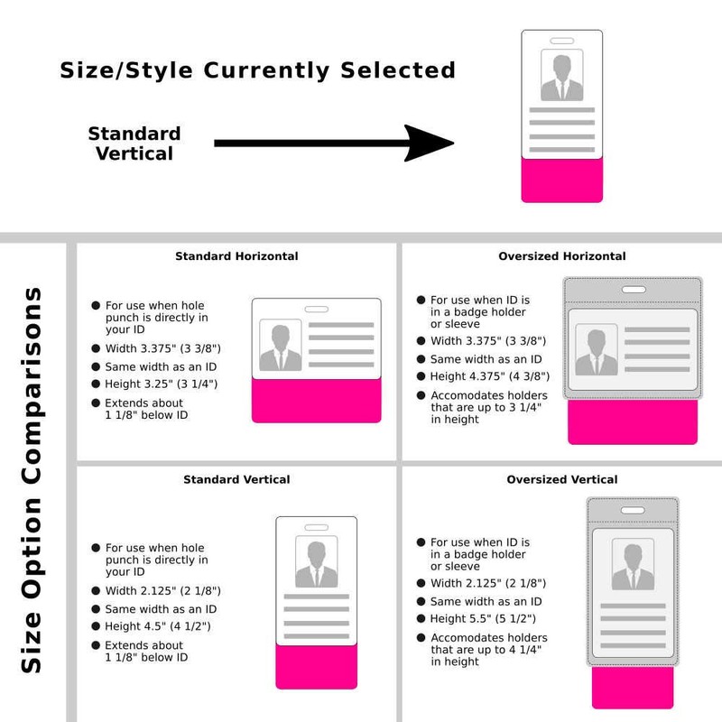 • Available in two sizes – Standard size for when your ID has a hole punched in it and Oversized if you use a badge holder/sleeve.