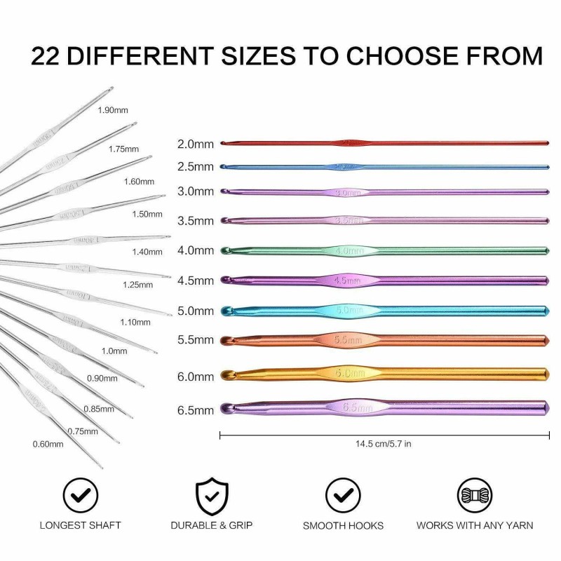 - MULTIPLE CRAFT SELECTION: Hugh selection for your craft knitting needed. Total 22 pieces from 0.6mm to 6.5mm. Easy to choose your right size crochet hooks. Create professional style when you use this crochet hooks. Conveniently application to manual, handicrafts, crocheted fabrics and more. Fit majority skill levels.