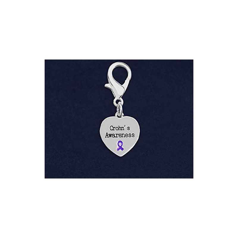 - CHARM SPECIFICATIONS:This Crohn's Disease awareness hanging charm is a silver heart charm with a purple ribbon and the words ``Crohn's Awareness". The heart charm is approximately 5/8 inch by 5/8 inch and has a clasp that will hook onto your purse or a pet's collar. This charm is a sterling silver plated and each one comes in a bag.