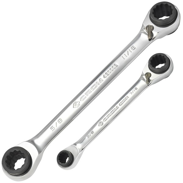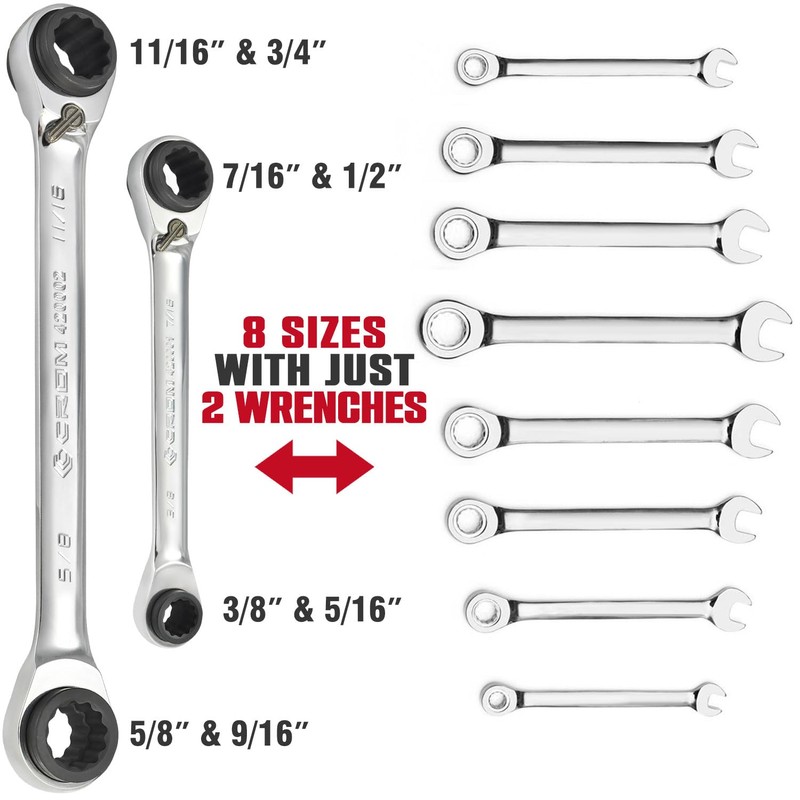 CROM 4-in-1 Reversible Ratcheting Wrench Set - 2 Piece, SAE, Double Box End Ratcheting Speed Wrench Set, 5/16”, 3/8”, 7/16”, 1/2", 9/16”, 5/8”, 11/16”, 3/4”, CR-V Steel, Mirror Polished (SAE 2 Piece)