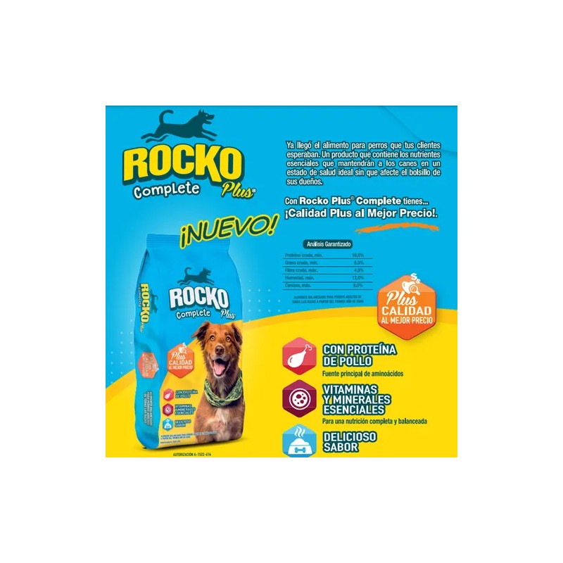 Descripción Limpia: Rocko Plus 20kg es el alimento completo y balanceado para perros adultos de todas las razas con calidad al mejor precio. Análisis Garántizado.