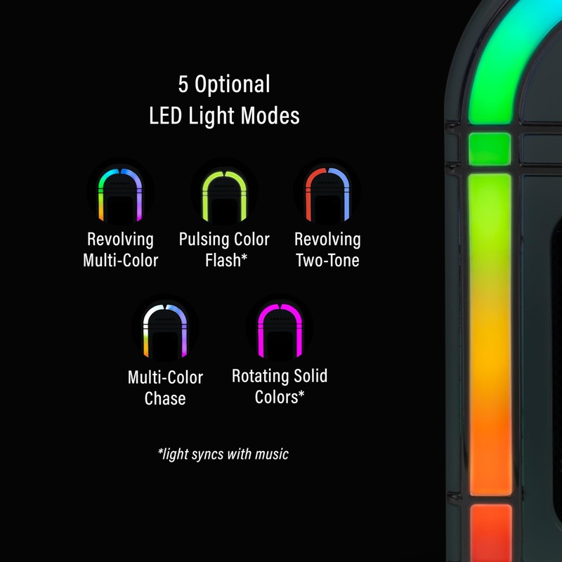- SOUND AND STYLE: Designed to look like a classic jukebox, this portable speaker features LED lights with five color-changing modes and music sync technology.