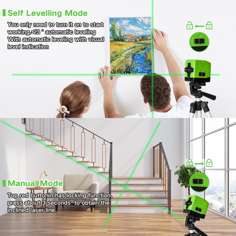 - Cross line laser with tripod: The cross line laser uses advanced sensor technology to provide you with accurate and reliable measurement results. Whether it is a horizontal or vertical line, the 110° range can meet your measurement requirements at different angles. Laser wavelength: 515, accuracy of ±0.2 mm/m. safe to use. Green lasers are more visible than red lasers.