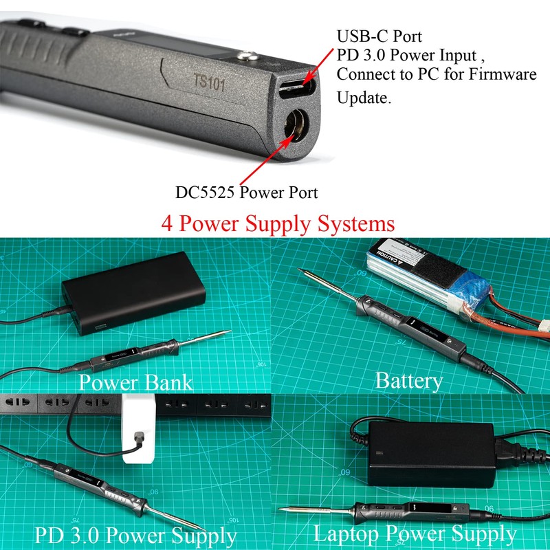 • TS101 verwendet DC und PD Dual Power Eingang. Der Leistungsbereich der beliebten DC5525 Schnittstelle wurde auf DC 9-24V (bis 65W) erweitert. Eine USB-C Schnittstelle ersetzt die originale Micro USB Schnittstelle, die für Firmware Upgrade dient, und einen Standard PD Netzteil bis 45W.Wir bieten ein 24V/3A EU Standard Netzteil, das auf 300 Grad in weniger als 10s beheizt werden kann.