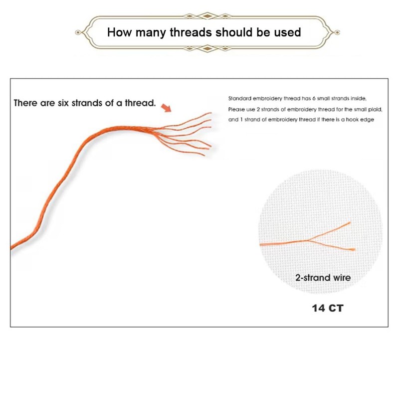 - 【2 strands should be used】14CT type please use 2 strands threads,1 strands threads for back stitch.One thread is composed of 6 strands, so you need to divide the 6 strands into three 2-strand lines before you work.