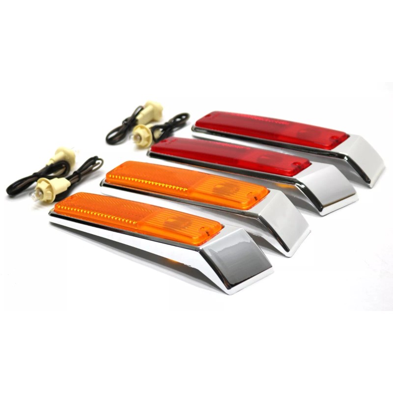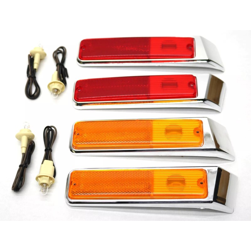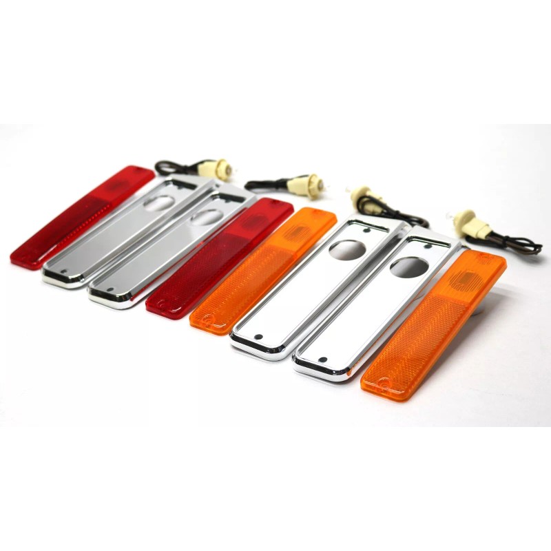 Brand New Set of Front AND Rear Side Marker Assemblies. This set includes all four chrome bezels, both amber front side marker lamps, both red rear side marker lamps, and four bulb sockets/pigtails. Please note, the rear bezels are the correct wrap-around style for 1984-1991 Grand Wagoneer. They will not fit 1974-1983 Cherokee models unless you want to weld closed the old holes and drill new ones farther back on the quarter panel.