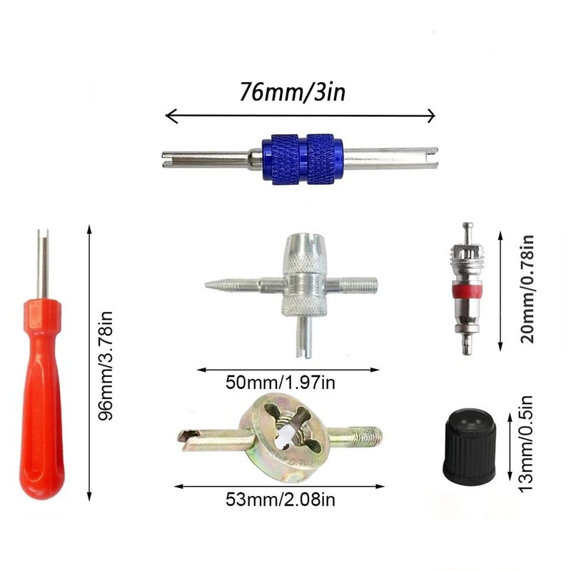 • Valve Core Repair Tool kit: The toolkit contains 20 valve cores + 10 tyre valve tips + 1 x 4-in-1 tyre valve repair tool + 1 x blue double-ended aluminium valve core remover + 1 x single-ended valve core remover + 1 x brass valve core remover, the content of the tool is very comprehensive and suitable for multi-scenario use.